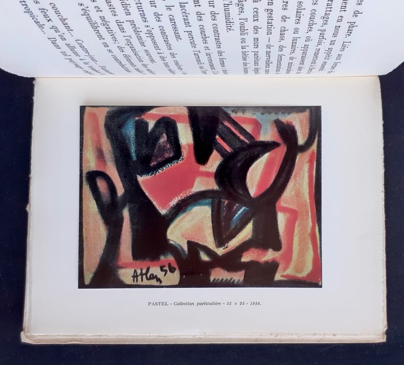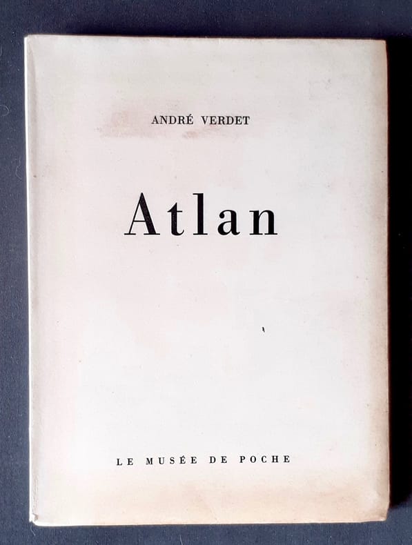 6 dessins originaux en noir de Michel Ragon in-texte et 7 dessins hors-texte en noir de Atlan. Premier texte de Michel Ragon sur Atlan écrit en 1950, ici en fac-similé et en édition originale. Tiré à 200 exemplaires numérotés, le nôtre portant le numéro 169. Enrichi d'un envoi autographe signé d'Atlan à Monsieur et Madame François Chauvet (serait-ce le comédien plasticien ?) où il est fait allusion à Samy Tarica, collectionneur et marchand d'art. Joint une carte de voeux pour 1960, reproduction de "Miroirs magiques du roi Salomon", de Atlan, avec un texte pré-imprimé de la famille Atlan et un texte ajouté, autographe, de l'artiste. Joint enfin une coupure du Figaro littéraire à son sujet, à lui destinée par Pierre Favre qui lui adresse sa carte. !!! !!! Du 3 octobre au 24 octobre il n'y aura pas d'expédition de colis: le libraire est en voyage. La librairie reste ouverte et nous répondrons sporadiquement aux emails. Merci pour votre compréhension. ––> From 3 October to 24 October, there will be no parcel deliveries as the bookseller will be travelling. The bookshop will remain open and we will respond to emails sporadically. Thank you for your understanding.