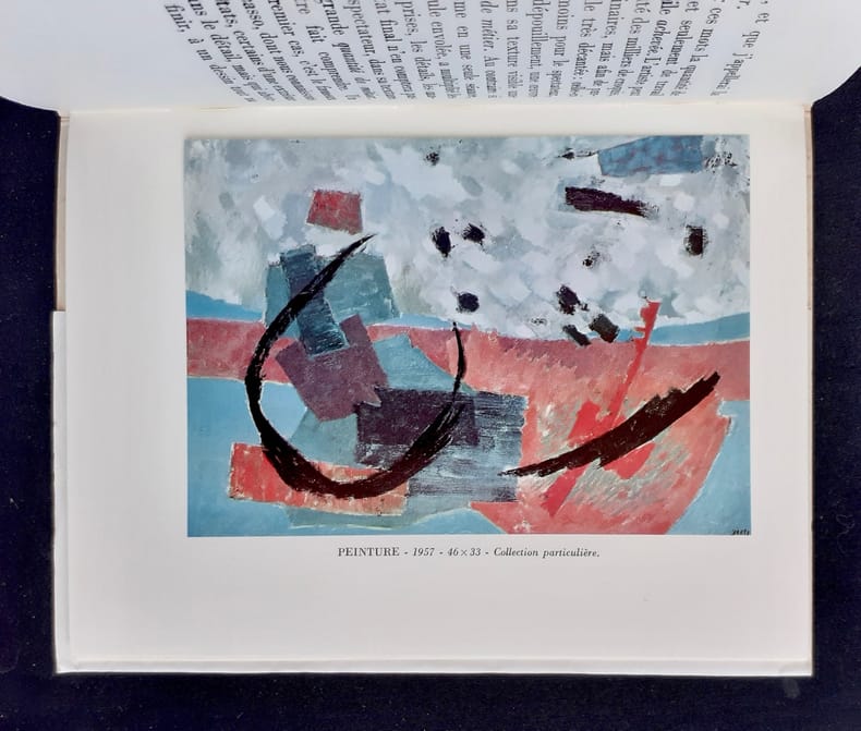 Paris Galerie Ariel 1966 1 vol. broché plaquette in-4, en feuilles, couverture illustrée, 16 pp., 5 reproductions contrecollées en couleurs et 2 reproductions sur zinc en couleurs à pleine page gravées par l'artiste. Tirage limité à 500 exemplaires. Publié à l'occasion de l'exposition de Goetz, 13 ans de peinture 1952-1965. Couverture défraîchie, sinon bon exemplaire provenant de la bibliothèque d'Alain Resnais.
