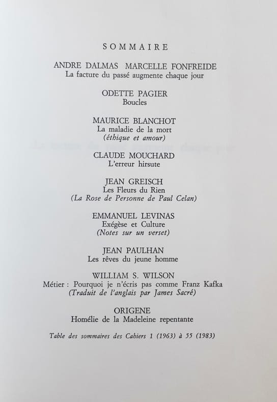 DALMAS (André). FONFREIDE (Marcelle). PAGIER (Odette). BLANCHOT (Maurice). MOUCHARD (Claude). GREISCH (Jean). LEVINAS (Emmanuel). PAULHAN (Jean). WILSON (Williams). ORIGENE.