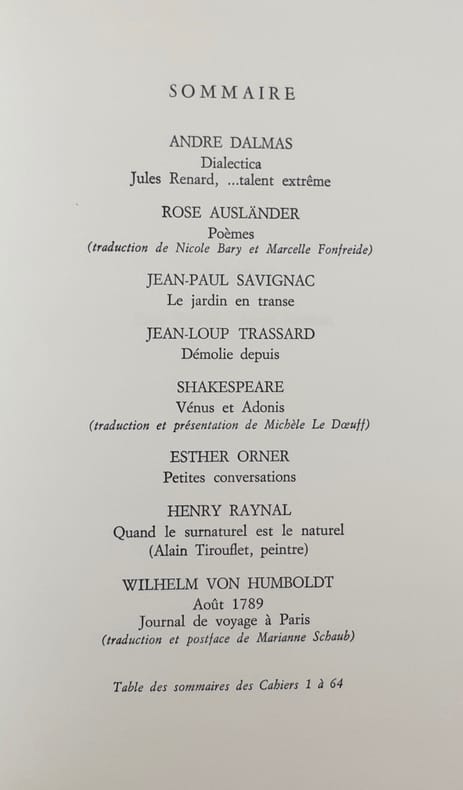 [Revue] André Dalmas, Rose Ausländer, Jean-Paul Savignac, Jean-Loup Trassard, Shakespeare, Esther Orner, Henry Raynal, Wilhelm von Humboldt...