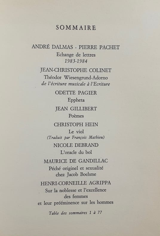 DALMAS (André). PACHET (Pierre). COLINET (Jean-Chritophe). PAGIER (Odette). GILLIBERT (Jean). HEIN (Christoph). DEBRAND (Nicole). GANDILLAC (Maurice de). (Jacob Boehme). AGRIPPA (Henri-Corneille).