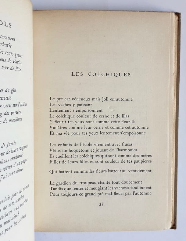 Édition originale du premier recueil de poèmes d’Apollinaire. Paris, Mercure de France, 1913. In-12 de 1 f. bl., faux-titre, titre, texte des pp. 7 à 200, 2 ff. de table, achevé d’imprimer, 1 f. blanc. Dans une riche reliure signée de Paul Bonet datée de 1962, couverture bi-partie, un tiers en box vert, deux tiers en box blanc, séparés verticalement. Un élégant décor vertical en box cache la séparation des peaux : ce décor abstrait est mosaïqué par de petites pièces où alternent le noir, le gris, le rouge, l’orange et le jaune. De chaque côté de ce motif sont mosaïquées de façon symétrique des petites formes géométriques variées : tons chauds (rouge, orange, jaune et blanc) sur le fond vert, et tons froids (noir, gris et vert) sur le fond blanc. Les deux plats sont ornés du même décor, de façon symétrique par rapport à l’axe du dos ; le box blanc est donc à droite sur le premier plat et à gauche sur le deuxième. Les doublures sont en daim blanc, les gardes en daim vert. Tranches dorées, couvertures spéciales de teinte brique conservées. Chemise de demi-maroquin vert à bandes et étui vert. Dimensions de la reliure : 184 x 115 mm.
