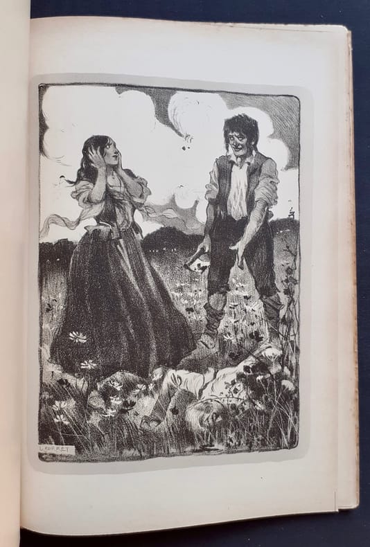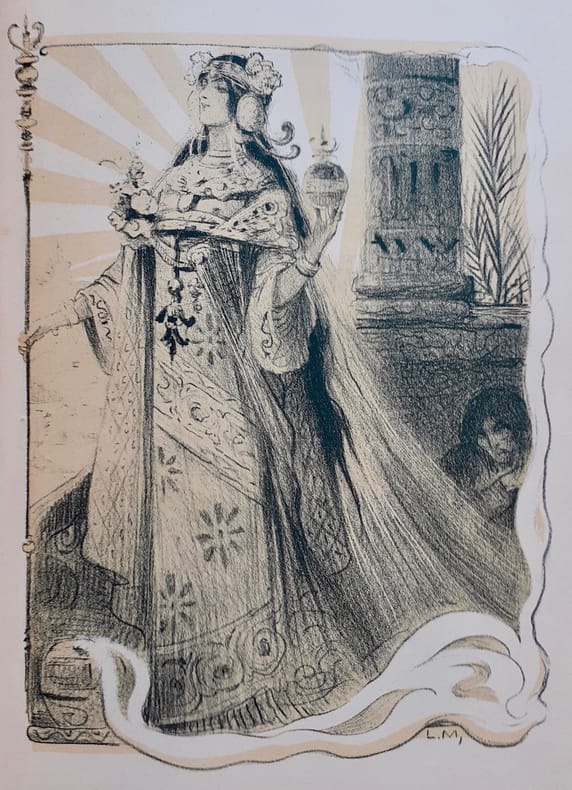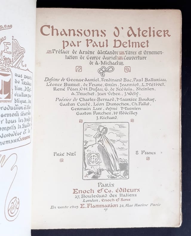 Préface de Arsène Alexandre. Paris : Enoch, 1901. Un volume 28,8x19,6cm broché sous couverture illustrée d'une lithographie en couleurs par A. Michael (en continu sur les deux plats et le dos), 150 pages illustrées de 15 planches hors texte en noir et en couleurs, avec les partitions des chansons. Livre orné en deux tons par George Auriol. Exemplaire en bon état.