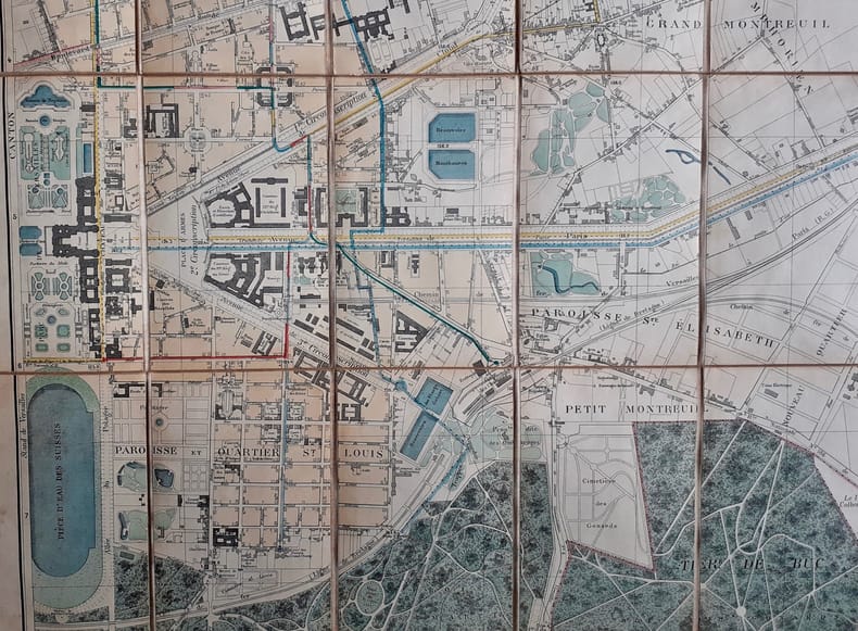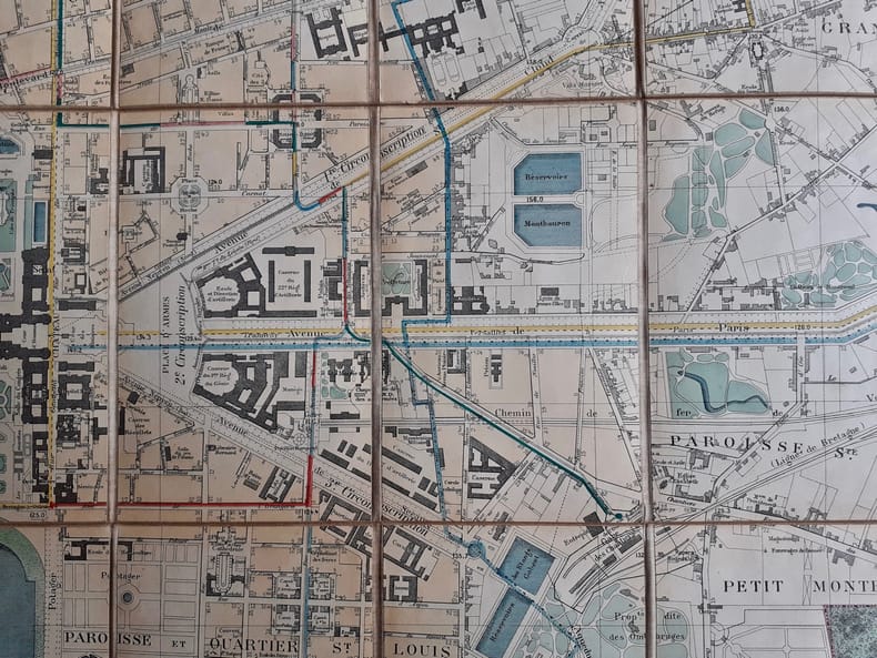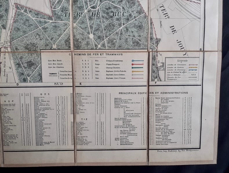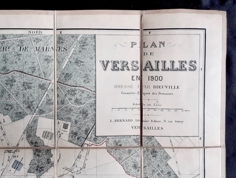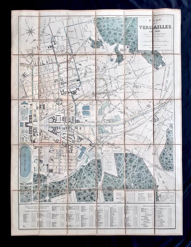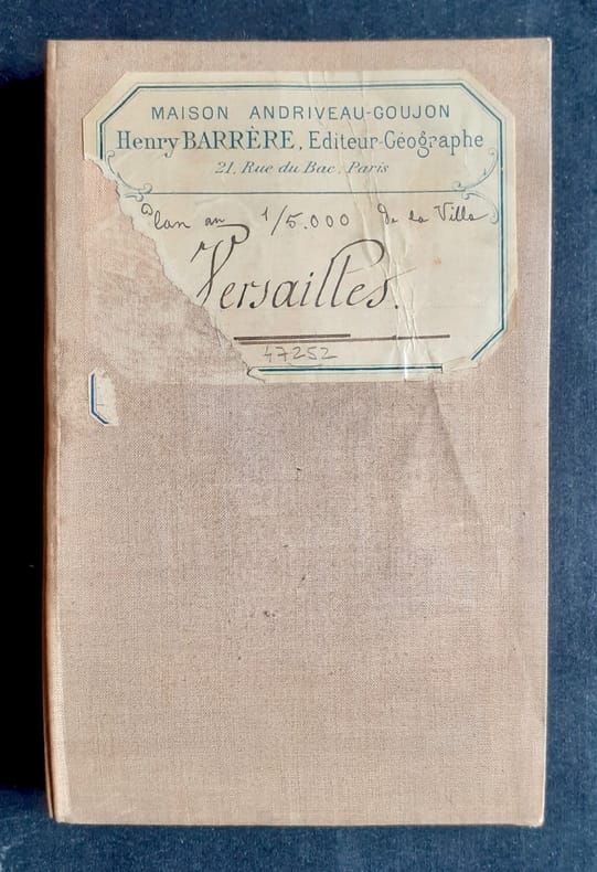 En 30 sections montées sur toile et pliées, formant une carte de 990x745mm, gravées chez L. Sonnet et imprimées chez Dufrenoy. En vente chez L. Bernard, librairie-éditeur à Versailles. Etiquette au dos de l'éditeur géographe Henry Barrère et portant le titre manuscrit "Versailles, plan au 1/5000 de la ville". Grande carte en couleurs de la ville de Versailles comprenant le château, les rues avec la numérotation des maisons, chemins de fer et tramways, les limites des communes, cantons et paroisses. Légendes des rues, places et avenues. Belle carte en bon état.