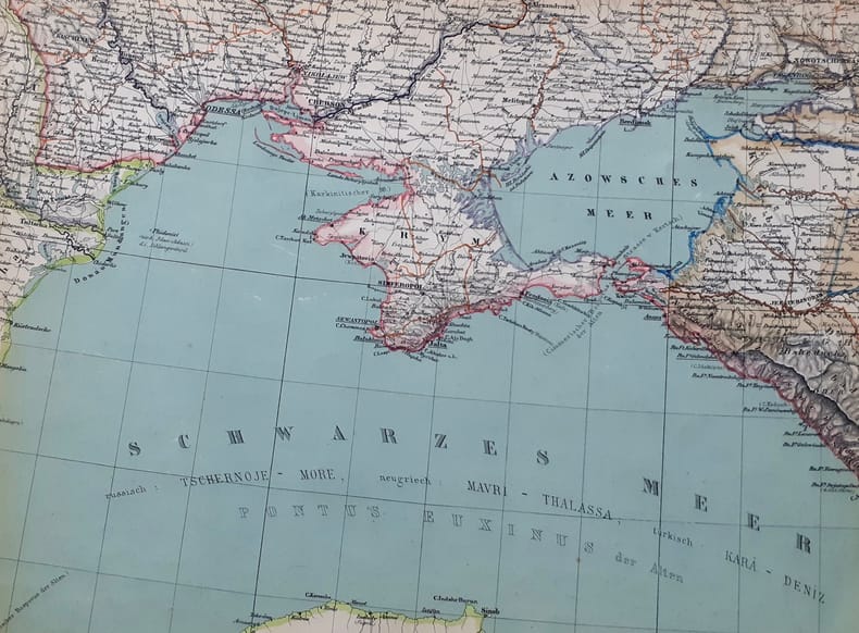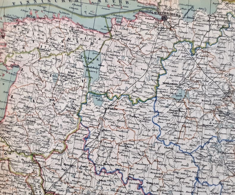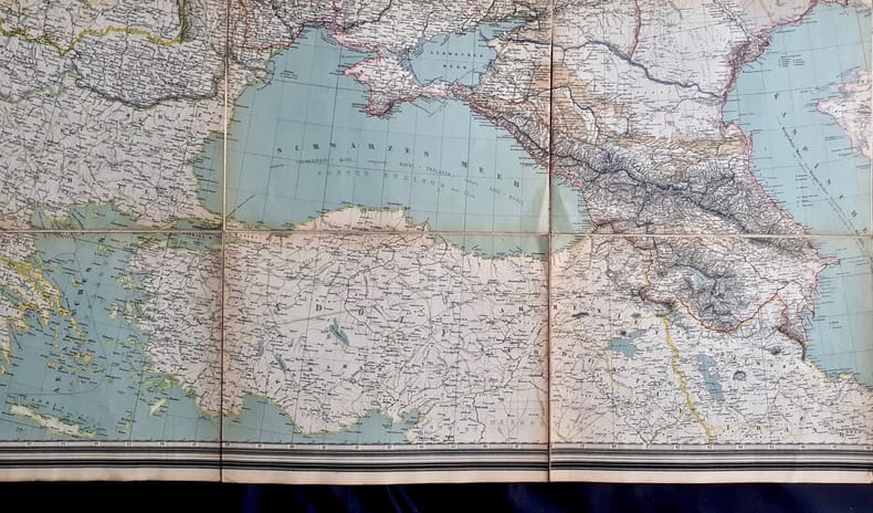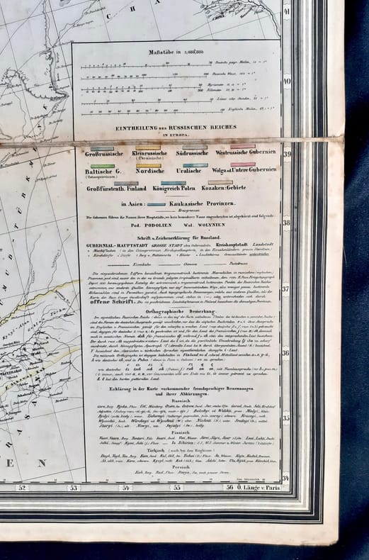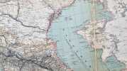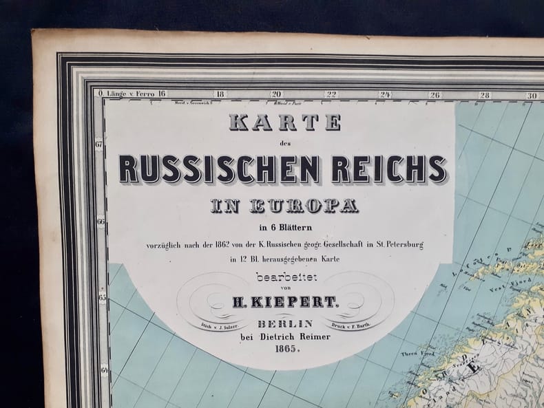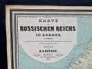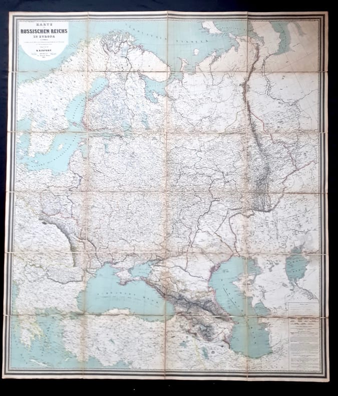 Berlin : Dietrich Reimer, 1865. Grande carte 1405x1244mm, entoilée en 24 sections, en couleurs à l'échelle 1/300 000. Présentant les frontières politiques de l'empire russe sous Alexandre II, la Russie des 5 mers : de la mer Baltique jusqu'en Sibérie, du nord de l'Empire Ottoman jusqu'à la mer d'Aral, le Kazakhstan et l'Ouzbékistan. Figurent également les routes, les chemins de fer. Bel exemplaire du premier tirage de cette monumentale carte originale établie par le cartographe allemand Johann Samuel Heinrich Kiepert (1818-1899), considéré comme l'un des cartographes les plus importants de la seconde moitié du XIXème siècle.