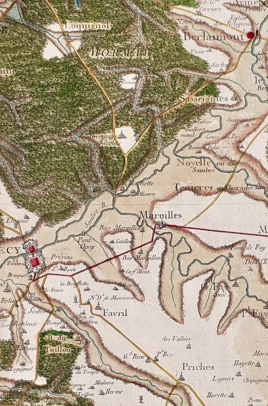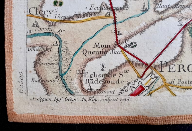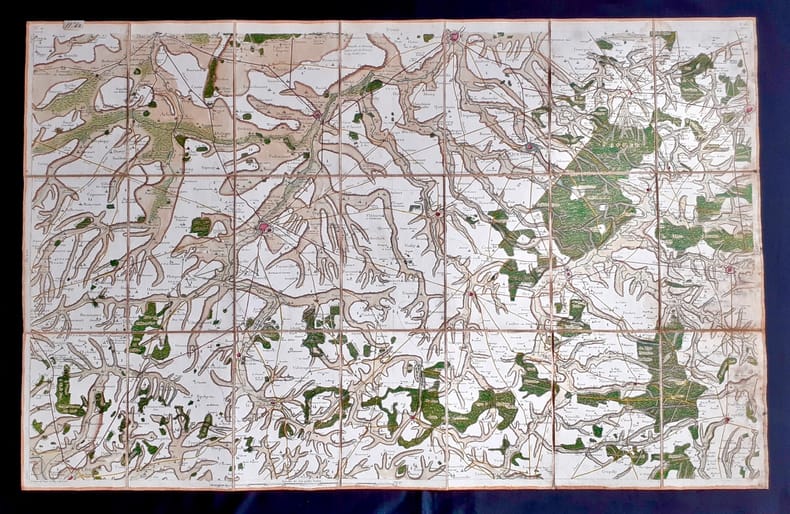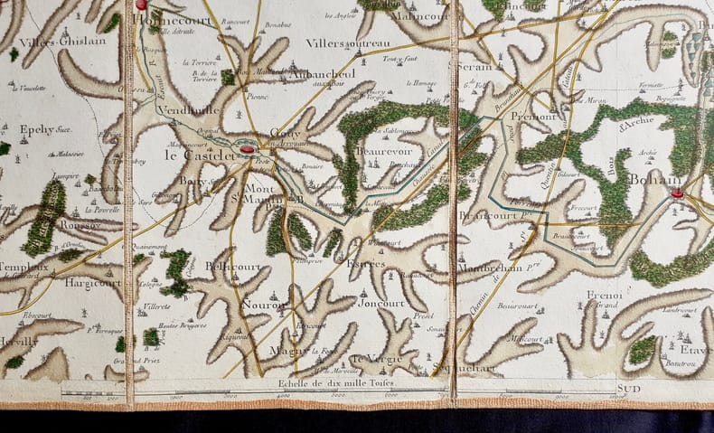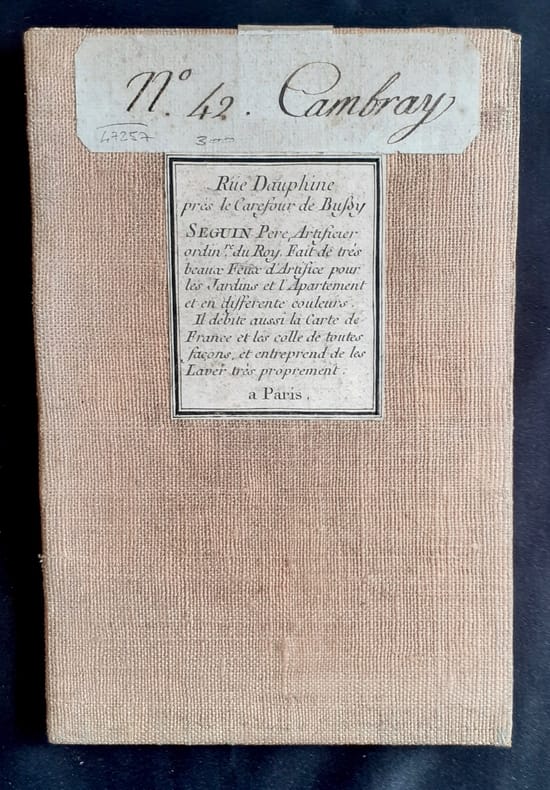 Paris, 1758. En 21 sections montées sur toile et pliées, formant une carte de 595 x 930 mm ; étiquette au dos portant le titre autographe "n°42 Cambray" et étiquette de l'éditeur Seguin père, artificier du roi. Onglet renseigné du numéro de la feuille. Carte gravée par Seguin, ingénieur-géographe du Roi, 1758. Feuille n°42 de la carte de Cassini, couvrant la région de Cambrai, appelée Cambray, dans le département du Nord. Elle s'étend au nord jusqu'à Valenciennes, au sud jusqu'à Péronne, à l'ouest jusqu'à Cerisy, et à l'est jusqu'à Maubeuge. Les places fortes revues par Vauban comme Avesnes-sur-Helpe (appelée Avesnes), Le Quesnoy, Landrecies (orthographiée Landrecy), Cambrai, Bouchain, Maubeuge et Valenciennes, sont signalées à l'aquarelle rouge. Les routes et chemins sont aquarellés en jaune, les cours d'eau en bleu et le relief en brun. L'échelle est en toises. Quelques rousseurs sur 3cm de la bordure droite, sinon belle et rare carte finement aquarellée.