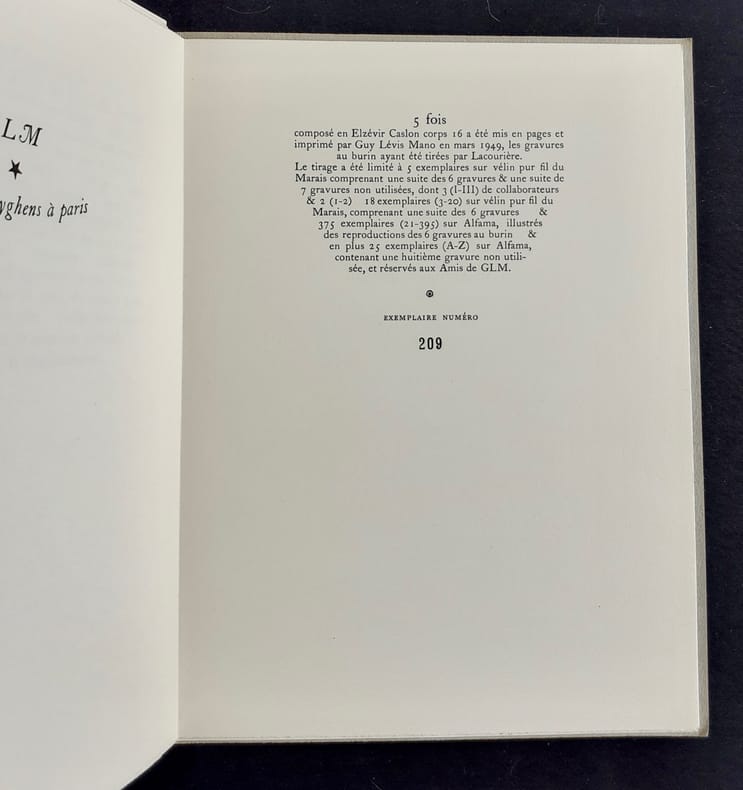 Paris : Guy Lévis-Mano (GLM), mars 1949. Un volume en feuilles (25,8x19,6 cm) sous couverture gris bleu, 34 pages. 6 gravures au burin de Javier Vilato en feuilles libres. Edition originale tirée à 423 exemplaires : 1/395 sur alfama. Bon état.