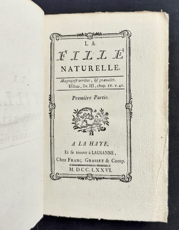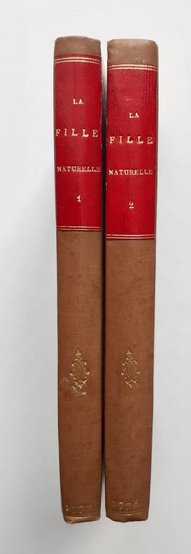 Rare contrefaçon de l'un des premiers ouvrages de Restif. Rives Childs, V, 8, p. 209. Le texte est identique à celui de la première édition de 1769, les fautes n’ayant pas été corrigées. « Le jeune Nicolas Anne Edme Rétif (1734-1806) est envoyé en 1751 à Auxerre pour être mis en apprentissage chez un imprimeur, où il séduit la belle épouse de son patron qu’il devait évoquer plus tard sous les traits de Mme Parangon. Devenu ouvrier typographe en 1755, il décide de se rendre à Paris où il ne tarde pas à entrer à l’Imprimerie royale. Il vient tout juste d’atteindre sa majorité. Esclave de son tempérament, il inaugure sans plus attendre la vie d’homme à bonnes fortunes qui sera toujours sienne. Environ 1760, et dans l’espoir de mettre un terme à ses fredaines, sa famille juge bon de lui faire épouser une fille d’Auxerre appelée Agnès Lebègue. Après avoir donné quatre filles à son épouse, il s’en sépare. De plus en plus il passe ses nuits à courir les mauvais lieux, afin d’y observer le vice, et, bien entendu, le pratique lui-même pour l’acquit de sa conscience. En 1767, il débute enfin dans les lettres en publiant ‘La Famille vertueuse’, roman en quatre volumes. Enhardi par le vague succès qu’il obtient, il décide de vivre uniquement de sa plume. Il se sent d’autant mieux armé pour cette lutte que, sachant la typographie, il sera capable d’imprimer lui-même ses ouvrages, et, par là, pourra se moquer des exigences des imprimeurs. En 1769, il donne ‘La Fille naturelle’, puis ‘Le Pied de Fanchette’. » (Dictionnaire des auteurs, IV, 70) « L’auteur a composé cette historiette intéressante d’après le récit d’Edme-Rapenot, libraire, qui avait connu l’héroïne et sa fille ». (Rives Childs) « Je mis aussitôt la plume à la main, dans une chambre isolée de l’imprimerie de Quillau, où j’étais alors occupé à caser moi-même ‘la Confidence nécessaire’. Ce fut l’ouvrage de huit jours... Nous étions en 1768 et c’était le quatrième ouvrage que je composais, depuis mon retour de Sacy au 1er octobre 1767. ‘La Fille naturelle’ est la plus attendrissante de toutes mes productions, l’histoire de ‘Zéphire’ exceptée, et même une des plus utiles. Je n’en ferai pas l’analyse, parce qu’elle est conservée dans ‘les Contemporaines’, en deux Nouvelles, l’une intitulée ‘la Sympathie paternelle’, l’autre ‘la Fille reconnue’, outre que j’en ai fait une comédie également intéressante, intitulée ‘la Mère impérieuse ou la Fille naturelle’, dont je rendrai compte. La vente de ce roman me fut avantageuse, et me fit subsister » (Mes ouvrages, p. 12-14) Précieux exemplaire, à l’état neuf, conservé tel que paru, non rogné dans son cartonnage muet d’attente. Provenance : ex libris manuscrit sur le titre « Alexandria Cocconia Polisiania, 1776 ».