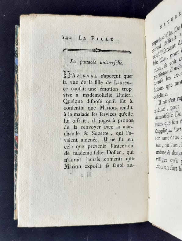 Rare contrefaçon de l'un des premiers ouvrages de Restif, qu’il considérait lui-même comme « la plus attendrissante de toutes ses [mes] productions ». A La Haye et se trouve à Lausanne, chez Franç. Grasset, 1776. 2 parties reliées en 1 volume in-12 de : I/ (1) f., viii pp., 155 pp., (3) pp., (1) f.bl. ; II/ (2) ff., 181 pp., (3) pp. Conservé dans son cartonnage muet d’attente, dos lisse avec le titre manuscrit à l’encre, non rogné. Reliure de l’époque 166 x 117 mm.