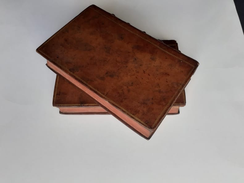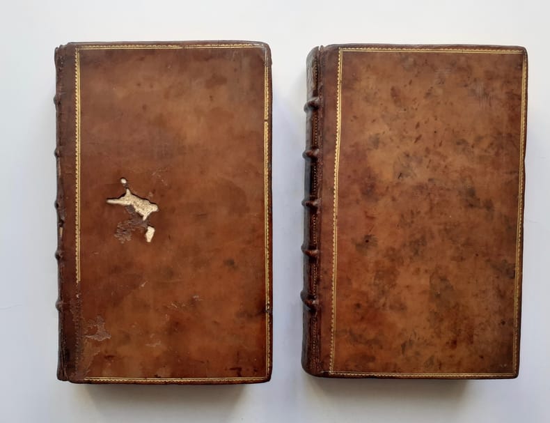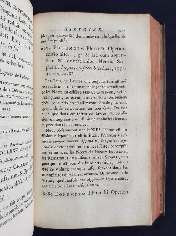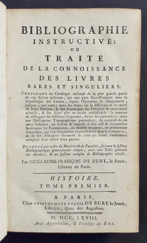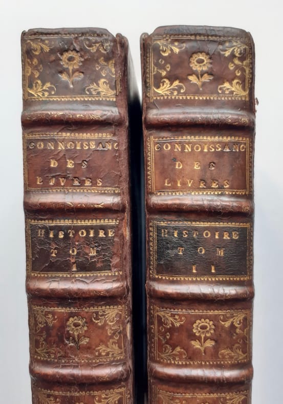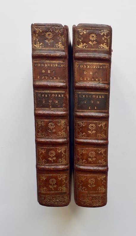 À Paris, chez Guillaume-François de Bure le jeune, 1768. 2 volumes in-8, veau brun marbré glacé, dos à nerfs cloisonnés et fleuronnés, pièces de titre et de tomaison, coupes filetées, tranches rouges (reliure de l'époque), XXIII, 631 et 685 pages. Ex-libris. Édition originale de ce traité de bibliophilie concernant les ouvrages historiques, par le libraire Guillaume-François Debure (1732-1782). Ouvrage de référence qui marqua son époque par l'ampleur des renseignements et des commentaires. Un petit manque de cuir sur le premier plat du premier tome sinon bel exemplaire.