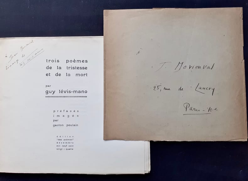 Paris : Editions "des poèmes", décembre 1924. Un volume (22x25cm) broché, sous couverture muette d'origine, (24) pages avec 6 dessins hors texte de Gaston Poulain reproduits au trait. Edition originale limitée à 200 exemplaires : 1/125 exemplaires sur alfa bouffant. Bon état. Belle impression de L. Beresniak. Exemplaire non coupé. Envoi autographe signé de Guy Lévis Mano adressé à Jean Morienval avec le bandeau d'expédition à son adresse.