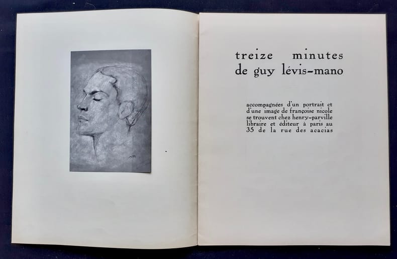 Paris : Henry Parville, juin 1927. Un volume (29x22,5 cm) en feuilles sous chemise brune à rabats portant 2 vignettes dont une illustrée, 20 pages. Un portrait de l'auteur et un dessin reproduit au trais de Françoise Nicole. Edition originale tirée à 218 exemplaires numérotés : 1/150 sur alfa. Bon état.