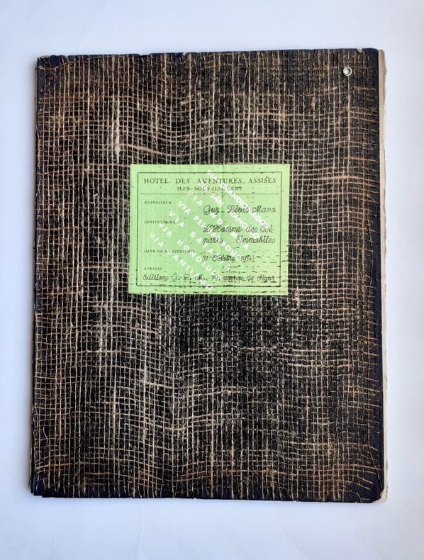 Guy Lévis Mano, 1934. 2 volumes brochés, le premier sous couverture en papier goudronné d'emballage à filet de corde, ornée d'une vignette de papier vert imprimé figurant une étiquette de colis maritime. 33 x 25,2 cm. et le second volume, en feuilles, dans un double feuillet faisant office de couverture. 32 x 24,2 cm.