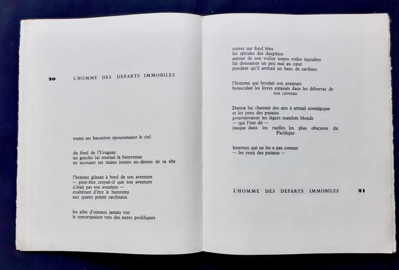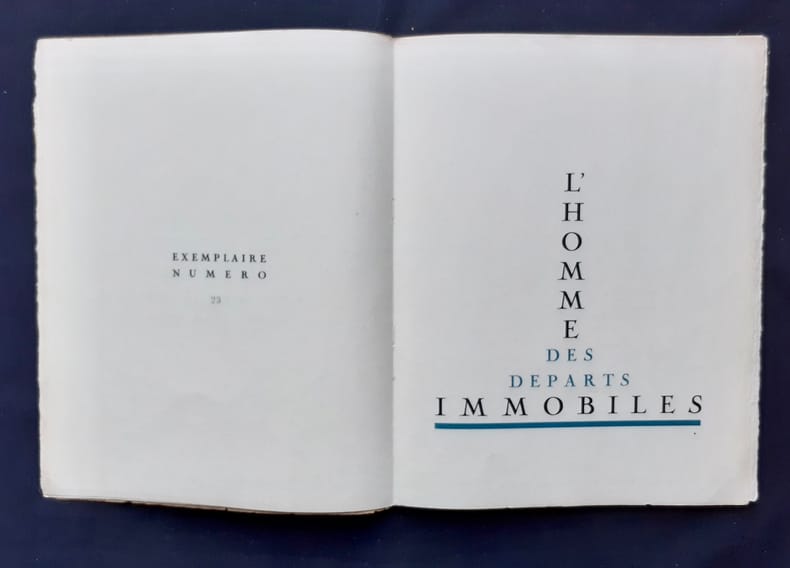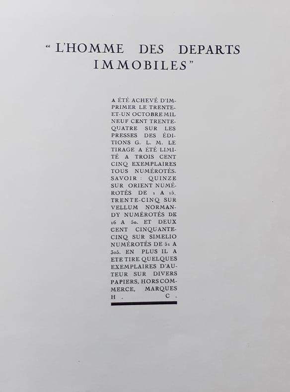 Ce fragment, première partie de "L'Homme des départs immobiles" est illustré de huit dessins de Raymond Gid reproduits au trait. Le texte et les dessins sont imprimés au seul recto des feuillets.Edition originale tirée à 150 exemplaires numérotés : 5 sur vellum (1-5), 20 sur Lafuma (6-25) & 125 sur Hélio (26-150), le n° 63. Très bel exemplaire de cet exercice typographique dû aux talents conjugués de GLM et du graphiste Raymond Gid et magnifié par la reliure d'Henri Mercher, en parfaite osmose avec l'ouvrage. Henri Mercher (1912-1976), relieur d'art ayant exercé dans son atelier au 18, rue Visconti à Paris de 1937 à sa mort. Il avait repris cet atelier à Canape chez qui il était entré en 1930 en tant que jeune ouvrier doreur. (Fléty; p. 126) Coron : Les éditions GLM, 1923-1974, n° 50.