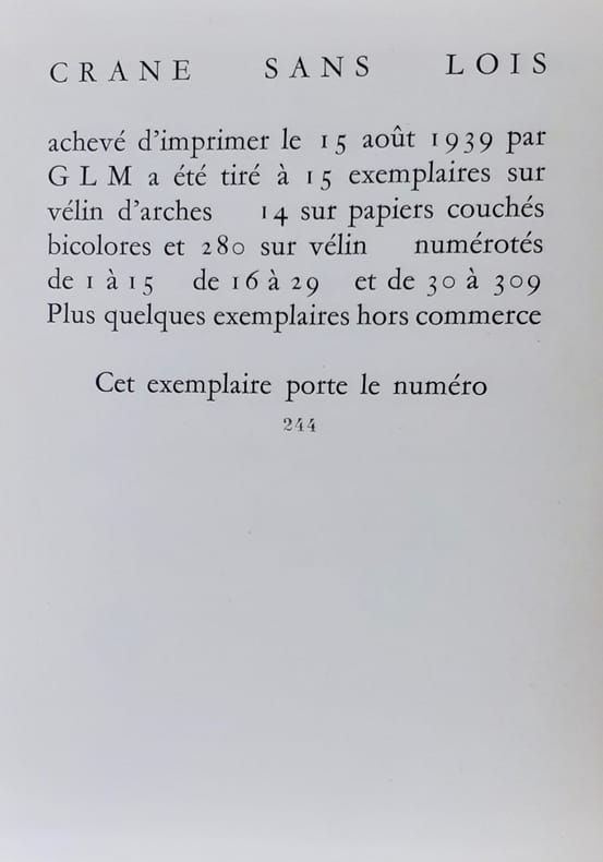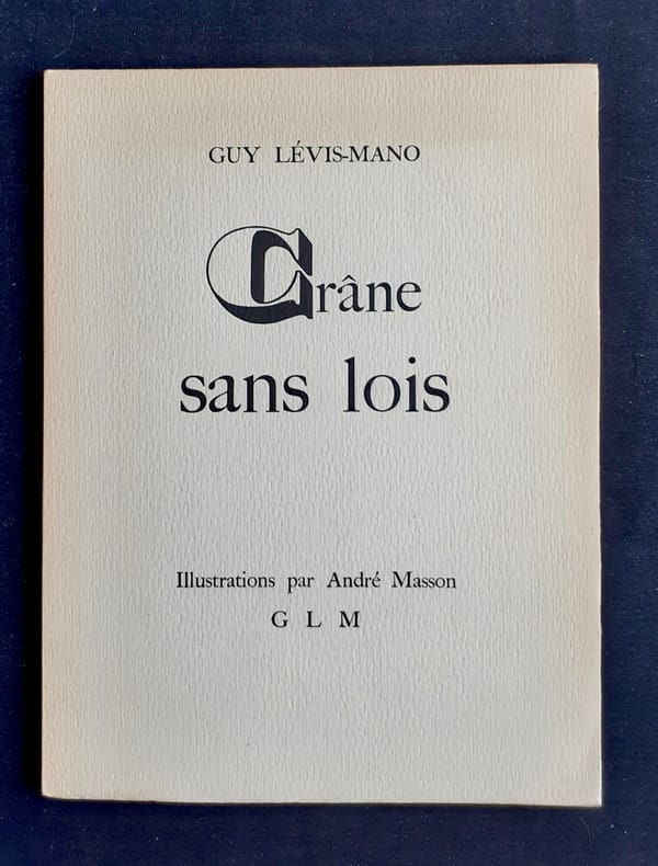 Paris : Guy Lévis-Mano (GLM), août 1939. Un volume broché (25,2x19,3 cm), (60) pages. 5 dessins d'André Masson reproduits au trais. Edition originale tirée à 309 exemplaires numérotés : 1/ 280 sur vélin. Bon état.