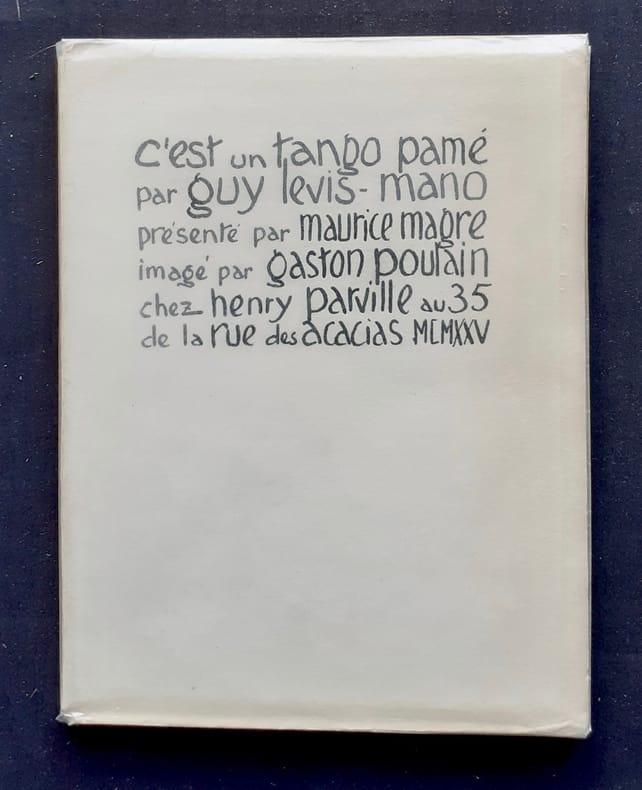 Paris : Henry Parville, décembre 1925. Un volume (23,2x17,7cm) broché, de (108) pages avec 8 dessins hors texte de Gaston Poulain reproduits au trait. Mention de seconde édition sur papier courant avec un envoi autographe signé et daté de Guy Lévis Mano. Bon état.