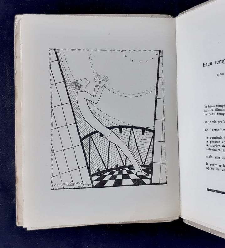 Illustré de huit dessins de Gaston Poulain reproduits au trait. Edition originale. Tirage à 235 exemplaires, n°G des 12 de tête sur vélin pur fil teinté Lafuma, signé par l'auteur et l'illustrateur (lettré selon l'ordre des lettres du nom de l'auteur, c'est donc le premier!). Il semblerait que cet exemplaire soit celui de Guy Lévis Mano. [9].