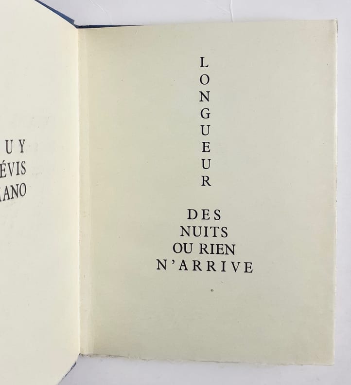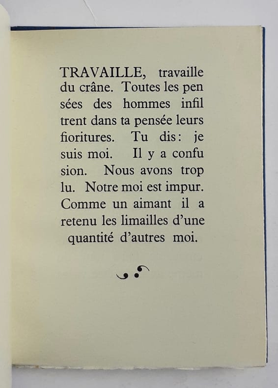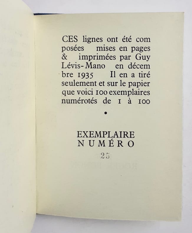 Paris : Guy Lévis-Mano (GLM), décembre 1935. Un volume relié (15,8x12,1 cm), (60) pages sous cartonnage couvert de papier velours bleu orné au premier plat du dessin de S.M. Dil de la page (13), tiré sur papier rouge. Sous étui. Edition originale tirée à 100 exemplaires numérotés sur papier simili-japon Alexandra vert.