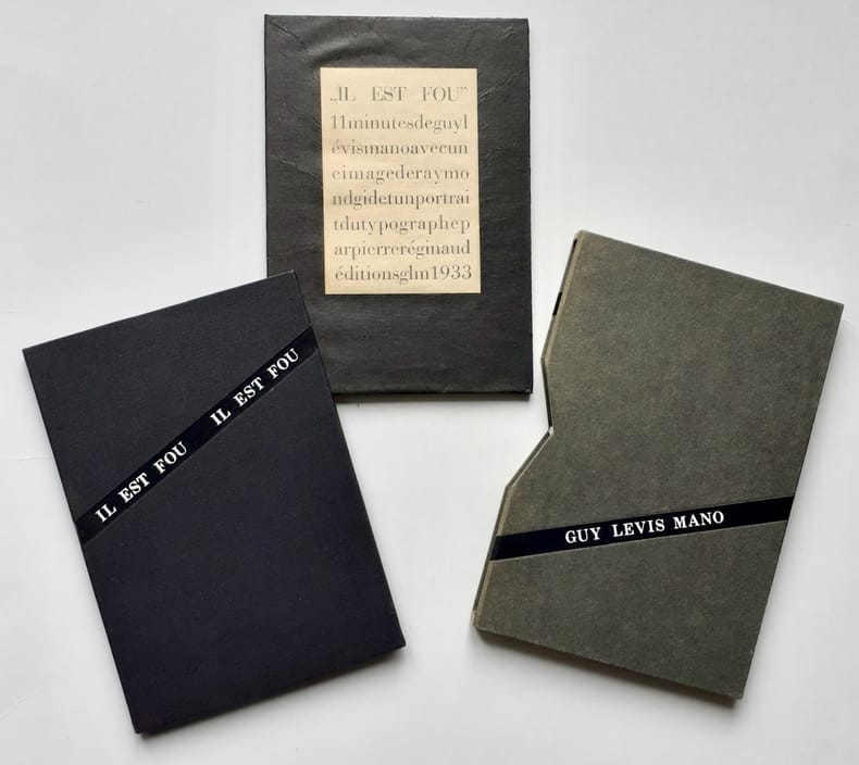Paris : Guy Lévis-Mano (GLM), décembre 1935. Un volume relié (16,7x11,8 cm), sous double emboitage avec titre et auteur en bandeaux (reliure signée et datée de 1994), exemplaire sous couverture rempliée portant une vignette imprimée, (44) pages avec un dessin de Raymond Gid reproduit au trait et une photographie de Pierre Réginaud reproduite en simili contrecollée. Edition originale tirée à 90 exemplaires numérotés, signés par Guy Lévis Mano. Il s'agirait du premier livre imprimé "sur presse à bras" par Guy Lévis Mano.