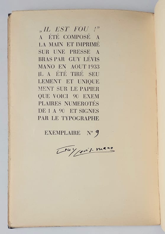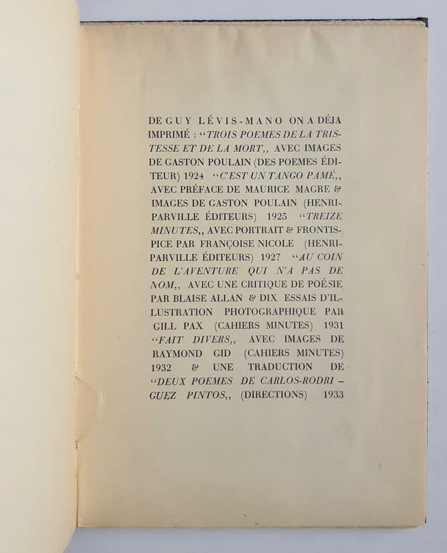 De 1923 à 1974 Guy Lévis Mano (1904-1980), ouvrier typographe et poète a imprimé et édité plus de 500 livres de poésie d'auteurs français et étrangers allant du surréalisme à Garcia Lorca, ou de Louise Labé à Andrée Chedid. "Le style typographique de G.L.M., qui fera rechercher ses livres dans l'avenir comme les plus représentatifs de notre époque, est parvenu à ce même équilibre heureux entre les audaces modernes et la plus sûre tradition."(Albert Béguin, 1949).
