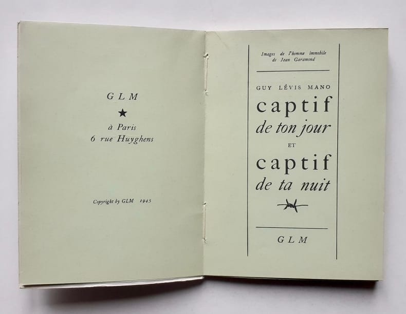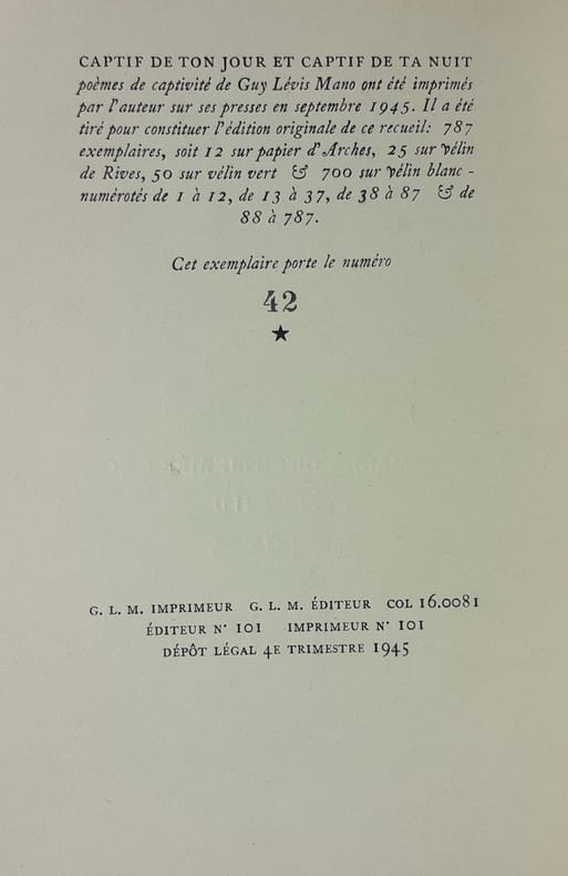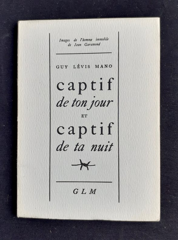 Poème de captivité écrit au Kommando disciplinaire 950. Stalag II D, à la mémoire de Roger Bonon, prisonnier de la mort authentique au fond de la Manche. Guy Lévis Mano est prisonnier de guerre de 1940 à 1945. Sous le pseudonyme de Jean Garamond, il écrit des poèmes qu'il parvient à expédier à Albert Béguin. Captif de ton jour et captif de ta nuit est l'un de ceux-ci, édité et imprimé par l'auteur à son retour de captivité.