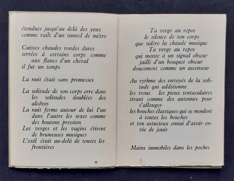Edition originale. Tirage à 150 exemplaires numérotés sur vélin blanc, n°95.Ce volume a été imprimé sur la petite presse à main donnée en 1933 par Carlos Rodríguez-Pintos, d'où l'indication en page de titre, qui remplace exceptionnellement le sigle de l'éditeur. [249]. !!! !!! Du 3 octobre au 24 octobre il n'y aura pas d'expédition de colis: le libraire est en voyage. La librairie reste ouverte et nous répondrons sporadiquement aux emails. Merci pour votre compréhension. ––> From 3 October to 24 October, there will be no parcel deliveries as the bookseller will be travelling. The bookshop will remain open and we will respond to emails sporadically. Thank you for your understanding.