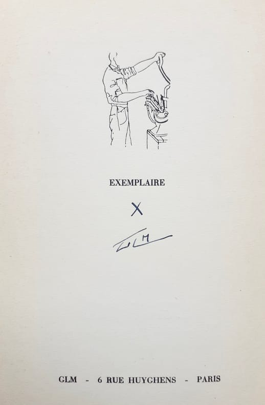 La Presse à main (GLM), juin 1947. Un volume (17x11,7 cm) broché, (24) pages. Edition originale limitée à 150 exemplaires numérotés : 1/25 réservés aux Amis de GLM sur vélin blanc numérotés et signés par Guy Lévis Mano. Bon état.