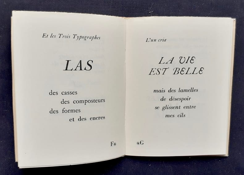 Divertissement typographique et poétique narrant avec un humour quelque peu désenchanté le travail de trois typographes dans leur atelier . " Dans les années 1930, le lancement des éditions GLM est aidé par quelques collaborateurs. Après avoir travaillé trois ans à la librairie La plume dor, rue de la Pompe, Lévis Mano est employé comme gérant de la Librairie 79, avenue de Ségur, en 1934. Il y fait la rencontre de Roger Bonon et de Georges Duchêne, propriétaire des lieux, avec qui lentente est immédiate. Lannée suivante Nancy Cunard, [... ], lui cède une presse Minerve à pédale. Trop encombrante pour la chambre où il loge, la machine est placée dans un local de la librairie, en accord avec Georges Duchêne qui se propose alors de remplir des tâches de secrétaire pour les éditions GLM. [...] Quant à Roger Bonon, il aide à limpression et à la fabrication des livres. Il apporte un soutien considérable à Lévis Mano. Cest aussi grâce à lui que les éditions GLM atteignent avant la guerre un rythme de publication qui nira que samenuisant après la Libération. En effet Roger Bonon est tué à Dunkerque dès le début des combats, en 1940. Lévis Mano, en plus davoir perdu un ami, a vu senvoler un collaborateur assidu." ( S. Rémy , Luvre typographique et éditoriale de Guy Lévis Mano : un acte dallégeance à la poésie, Mémoire de recherche, Sous la direction de Dominique Varry , Professeur des Universités à lEnssib, Université Lumière , Lyon II , 2009 )