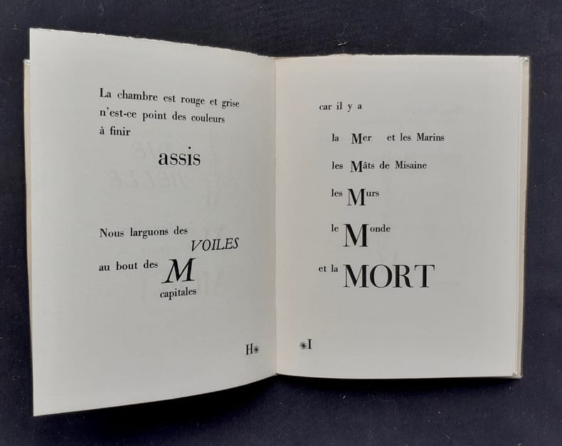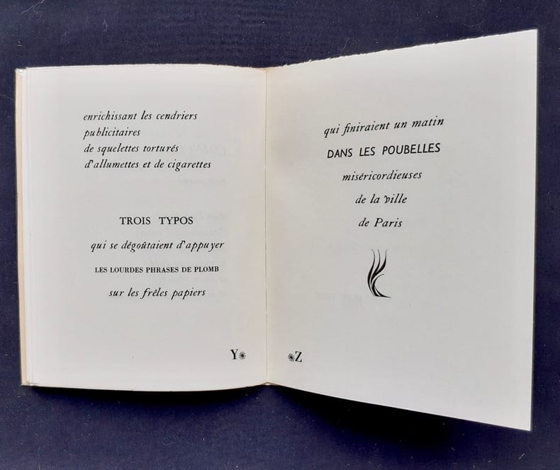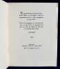 Paris : La Presse à main (GLM), mai 1967. Un volume (19x14,5 cm) broché, 20 feuillets paginés de A à Z. Edition limitée à 651 exemplaires numérotés : 1/635 sur bouffant fleur d'alfa. Réédition et recomposition dédiée à Roger Bonon qui formait avec Guy Lévis Mano et Georges Duchêne le trio des typographes en 1935. Bon état.