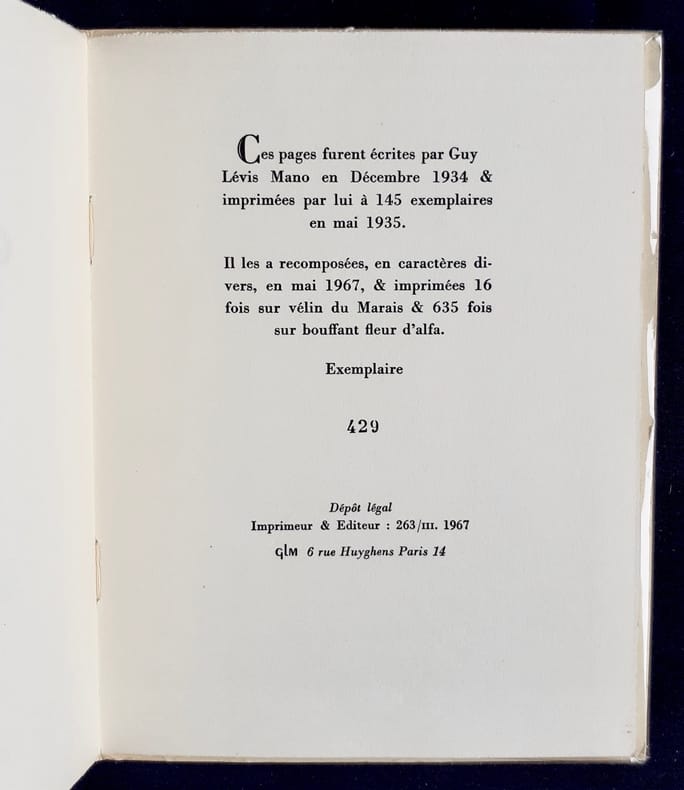 Paris GLM 1967 1 vol. broché ( 19 x 14,5 cm ) " Ces pages furent écrites par Guy Lévis Mano en décembre 1934 et imprimées par lui à 145 exemplaires en mai 1935; il les a recomposées en caractères divers, en mai 1967, & imprimées 16 fois sur vélin du Marais, & 635 fois sur bouffant fleur d'alfa." Exemplaire n° 540 . Réédition dédiée à Roger Bonon " tué à Dunkerque en 1940 " . Broché couverture souple crème imprimée . Très bon état .