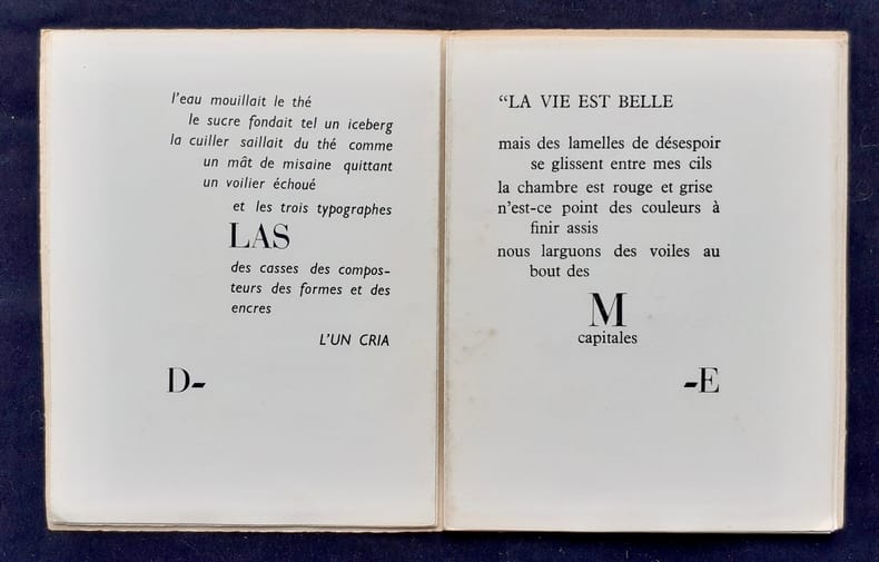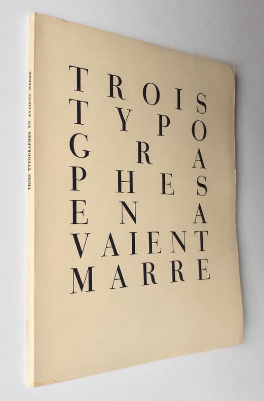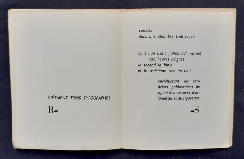Paris : La Presse à main (GLM), mai 1967. Un volume (19x14,5 cm) broché, 20 feuillets paginés de A à Z. Edition limitée à 651 exemplaires numérotés : 1/635 sur bouffant fleur d'alfa. Réédition et recomposition dédiée à Roger Bonon qui formait avec Guy Lévis Mano et Georges Duchêne le trio des typographes en 1935. Bon état.