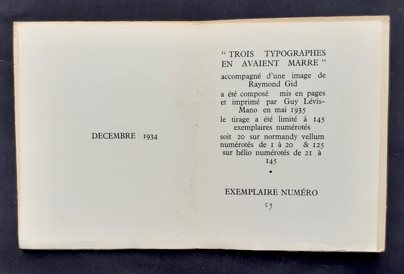 Tirage 651 exemplaires, n°15 de tête sur vélin du Marais. Réédition dédiée à Roger Bonon "tué à Dunkerque en 1940" qui formait avec Guy Lévis Mano et Georges Duchêne le trio des typographes en 1935 (ref. Coron 64) [500]. !!! !!! Du 3 octobre au 24 octobre il n'y aura pas d'expédition de colis: le libraire est en voyage. La librairie reste ouverte et nous répondrons sporadiquement aux emails. Merci pour votre compréhension. ––> From 3 October to 24 October, there will be no parcel deliveries as the bookseller will be travelling. The bookshop will remain open and we will respond to emails sporadically. Thank you for your understanding.