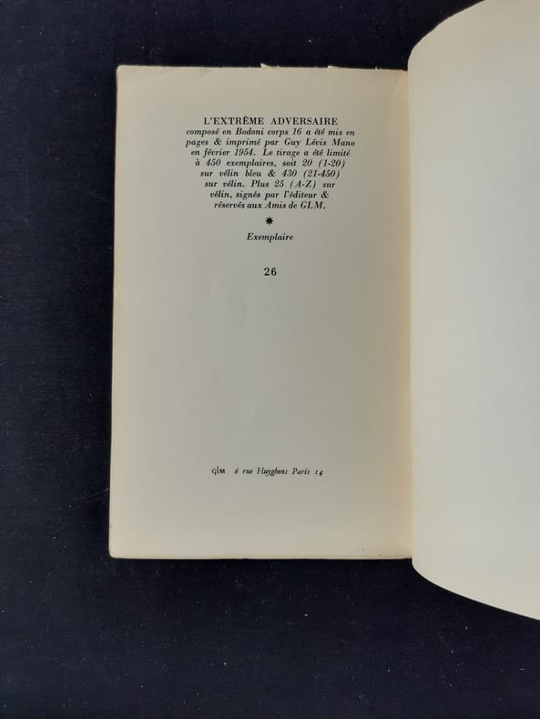 Paris : Guy Lévis Mano (GLM), février 1954. Un volume (21,3x13,1 cm) broché, 40 pages. Edition originale limitée à 475 exemplaires numérotés : 1/ 430 sur vélin. Bon état.