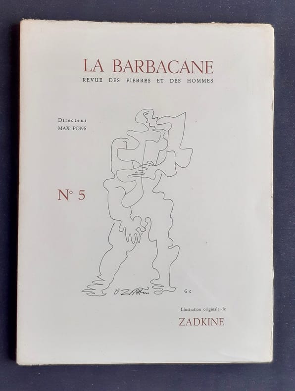 Saint-Front-sur-Lémance, directeur : Max Pons. Un volume 22,2x16,3cm broché sous couverture illustrée, 50 pages illustrées de deux reproductions de dessins de Zadkine. Bon état. Tirage à 510 exemplaires: 1/500 sur vélin à la cuve numéroté. Bel envoi autographe signé de Max Pons adressé au poète Marcel Béalu. Exemplaire hors commerce réservé aux collaborateurs, avec un envoi aitographe signé de Max Pons adressé à Jean Follain.