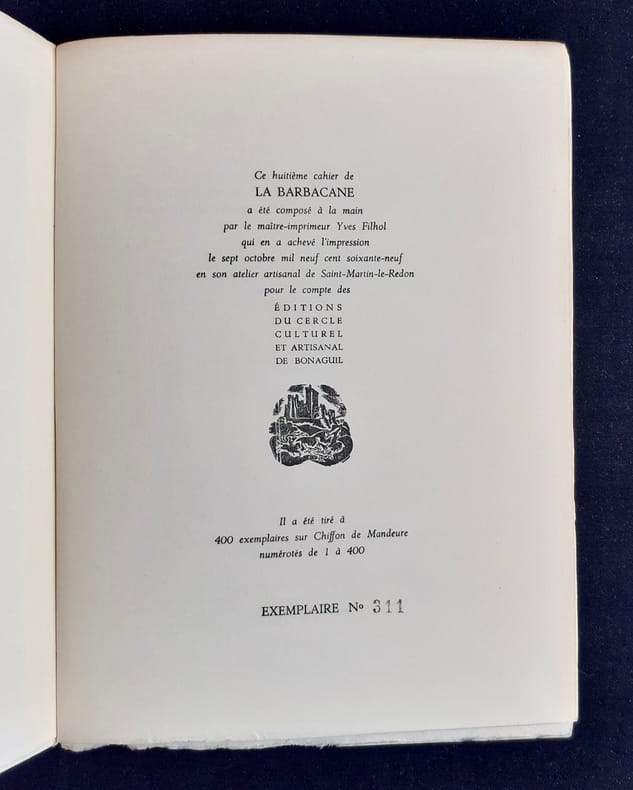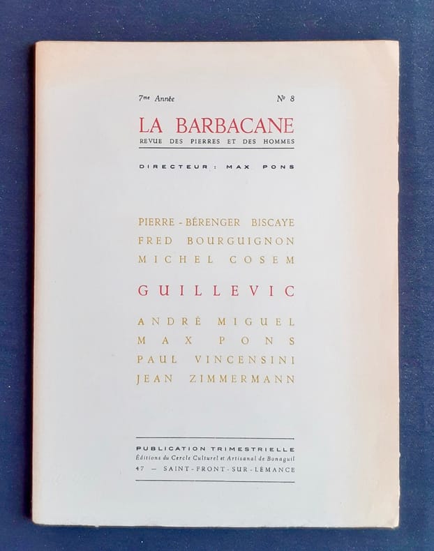 Saint-Front-sur-Lémance, directeur : Max Pons. Un volume 22,2x16,3 cm broché sous couverture imprimée, 36 pages. Tirage à 400 exemplaires sur papier chiffon de Mandeure. Avec 12 poèmes inédits d’Eugène Guillevic. Bon état.
