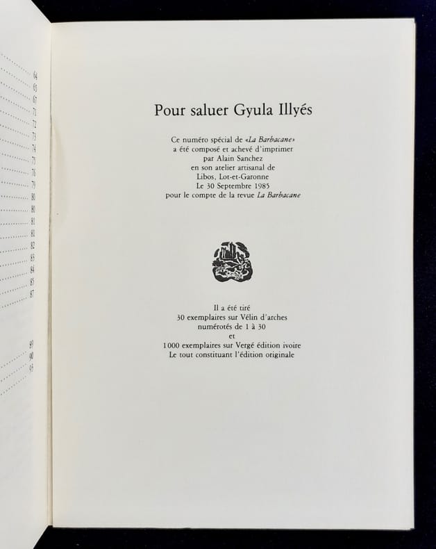 La Barbacane. Revue des pierres et des hommes. Septembre 1985: Textes choisis par Georges Gara. Hommages et témoignages de Georges-Emmanuel Clancier, Robert Sabatier, Jean Rousselot, Max Pons, Eugène Guillevic, Georges Charaire, etc. Saint-Front-sur-Lémance, directeur : Max Pons. Un volume 22,2x16,3cm broché sous couverture illustrée, 96 pages. Bon état. Tirage à 1030 exemplaires: 1:1000 sur papier vergé.