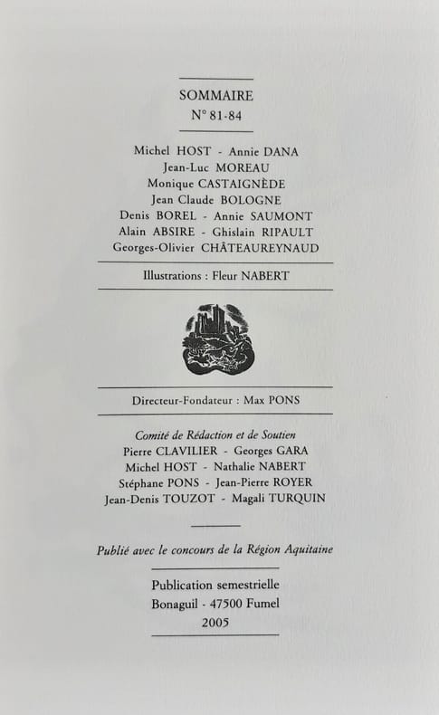 Belle revue littéraire imprimée en typographie par Alain Sanchez, animée par Max Pons durant plus de 50 ans, de 1963 jusqu'en 2016.