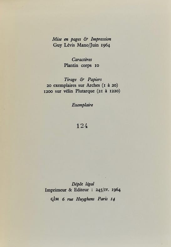 Paris GLM 1964 petit in-8 broché Paris, GLM (Guy Lévis Mano), 1964. 19 x 14,5 cm, petit in-8, 63 pp., 4 dessins en noir par André Masson dont un en frontispice et un à double page, broché sous couverture jaune vif imprimée.