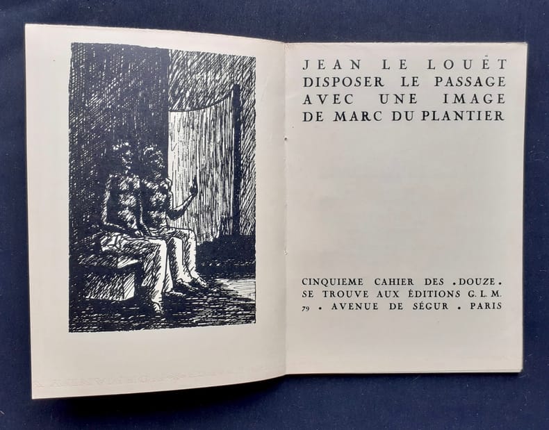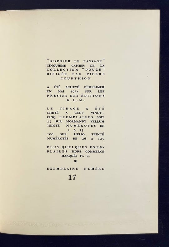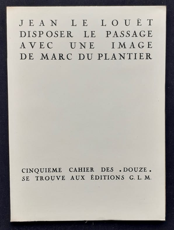 Paris : Guy Lévis Mano (GLM, cinquième cahier des Douze), mai 1935. Un volume (22,2x16,1 cm) broché, (32) pages. Avec 1 dessin de Marc Du Plantier reproduit au trait. Edition originale tirée à 125 exemplaires numérotés : 1/25 sur normandy vellum teinté. Bon état.