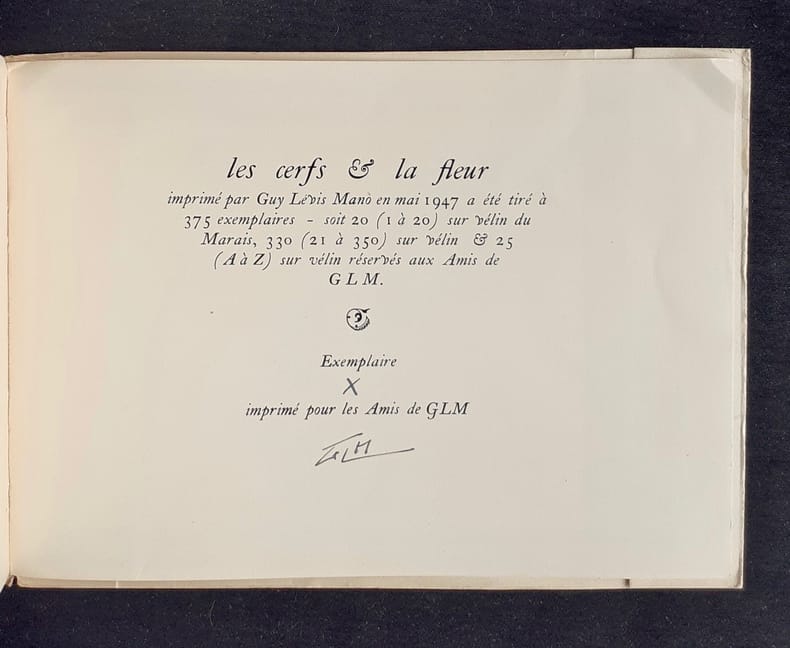 Paris, GLM, 1947, in-12° à l'italienne, n. n., env. 30 p., ill., un des 330 ex. sur vélin du Marais (num. de 21 à 350) portant le n° 68, brochure originale, rempliée.