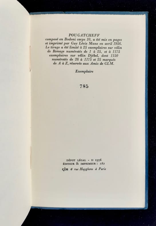 Paris: Guy Lévis Mano (G.L.M.), avril 1956. Un volume 19x11,4cm broché, (72) pages sous couverture bleu sombre imprimée. Bon état. Tirage à 1200 exemplaires numérotés: 1/1175 sur vélin Djébel.