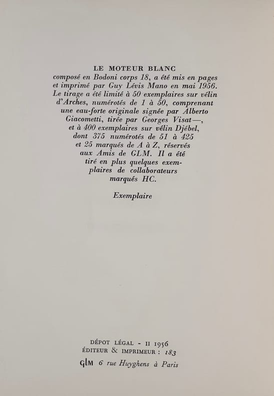 Paris, G.L.M., 1956, in-8, broché, non coupé. Edition originale. 1/50 ex. de tête sur vélin d’Arches comprenant une eau-forte originale, justifiée et signée d’Alberto Giacometti. Elle a été tirée par Georges Visat. Parfait état.