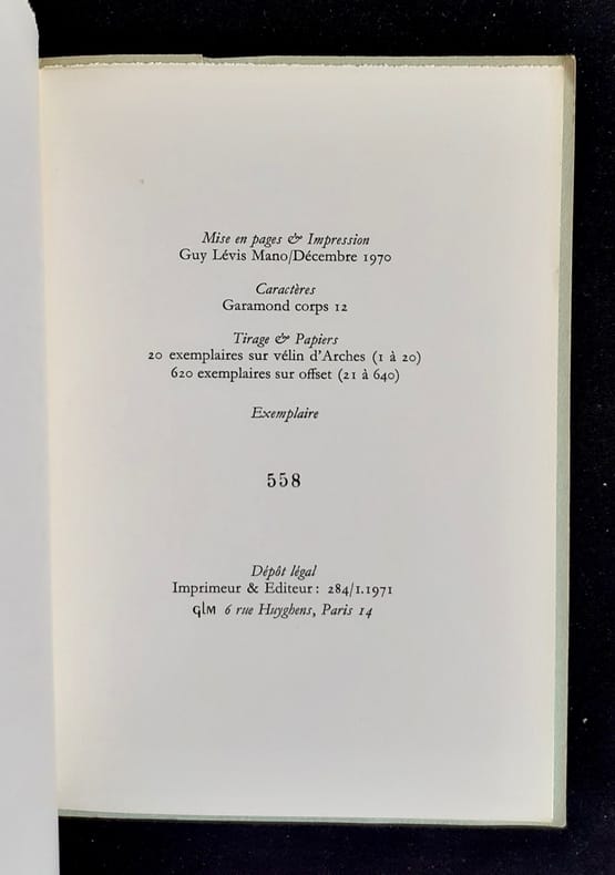 Paris: Guy Lévis Mano (GLM), décembre 1970. Un volume 19x13,3cm broché de (36) pages sous couverture bleu pâle imprimée et rempliée. Édition originale tirée à 640 exemplaires: 1/620 sur papier offset.