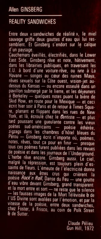 Broché, paru en 1972 chez Christian Bourgois - 1ère édition française qui fait suite à Kaddish et planet news ATTENTION: malheureusement exemplaire de bibliothèque avec les marques d'usage , le prix en tient compte pour ce texte devenu difficile à trouver