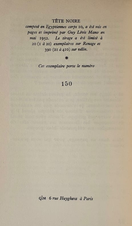 Paris: Guy Lévis Mano (G.L.M.), mai 1952. Un volume 20,7x13,1cm broché, (36) pages. Bon état. Édition originale tirée à 410 exemplaires: 1/390 sur vélin.