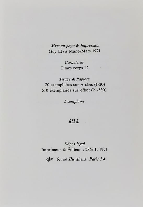 Paris: Guy Lévis Mano (GLM), mars 1971. Un volume 19,5x14,3cm broché de (32) pages. Petite déchirure de 3cm en quatrième de couverture sinon bon état. Édition originale tirée à 530 exemplaires: 1/510 sur papier offset.