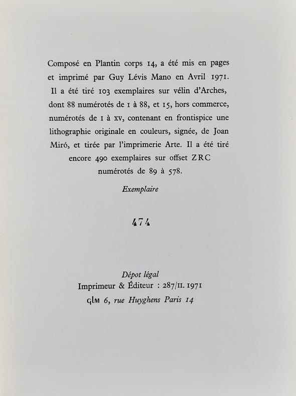 GLM, Paris 1971. Petit in-8 (195 x 140 mm) en feuilles, 46 pages sous couverture blanche à rabats imprimée en noir, étui de l'éditeur. Édition originale. Tirage : 103 exemplaires numérotés sur vélin d'Arches dont XV H.C. illustrés en frontispice d'UNE LITHOGRAPHIE ORIGINALE EN COULEUR DE JOAN MIRÓ signée au crayon. La lithographie a été tirée sur double feuillet (190 x 280 mm) par l'Imprimerie Arte à Paris. Exemplaire numéroté sur Arches. Parfait état dans son étui d'origine.