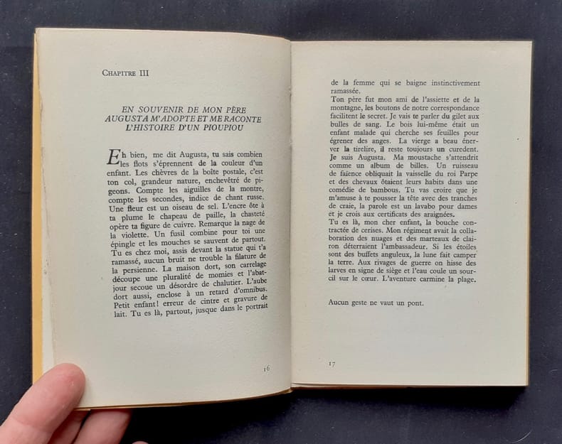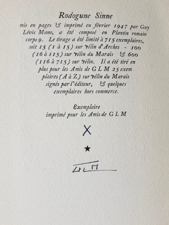 Paris: Guy Lévis Mano (GLM), février 1947. Un volume 16,4x11,3cm broché, 70 pages, sous couverture jaune imprimée et rempliée. Bon état. Édition originale tirée à 740 exemplaires: 1/25 sur vélin du Marais, justifié «X» et signé des initiales de Guy Lévis Mano.