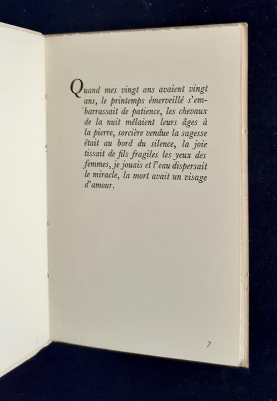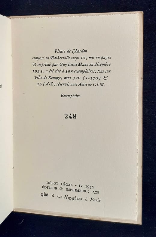 Paris: Guy Lévis Mano (GLM), décembre 1955 . Un volume 14x9cm, broché de 36 pages sous couverture ivoire imprimée. Édition originale tirée à 395 exemplaires numérotés sur vélin de Renage. Bon état.