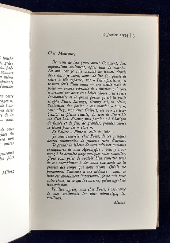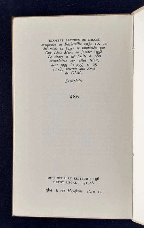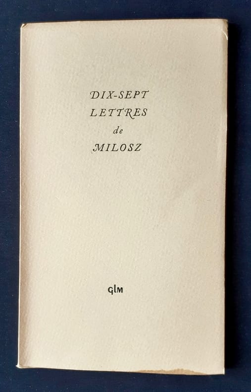 GLM Broché 1958 In-12 (11 x 19 cm), broché, 17 & 4 pages. Belle édition de quelques lettres de Milosz, tirage limité à 980 exemplaires, numérotés (le nôtre n°334). Menus incidents habituels en couverture, intérieur très frais, bel état général. Livraison a domicile (La Poste) ou en Mondial Relay sur simple demande.